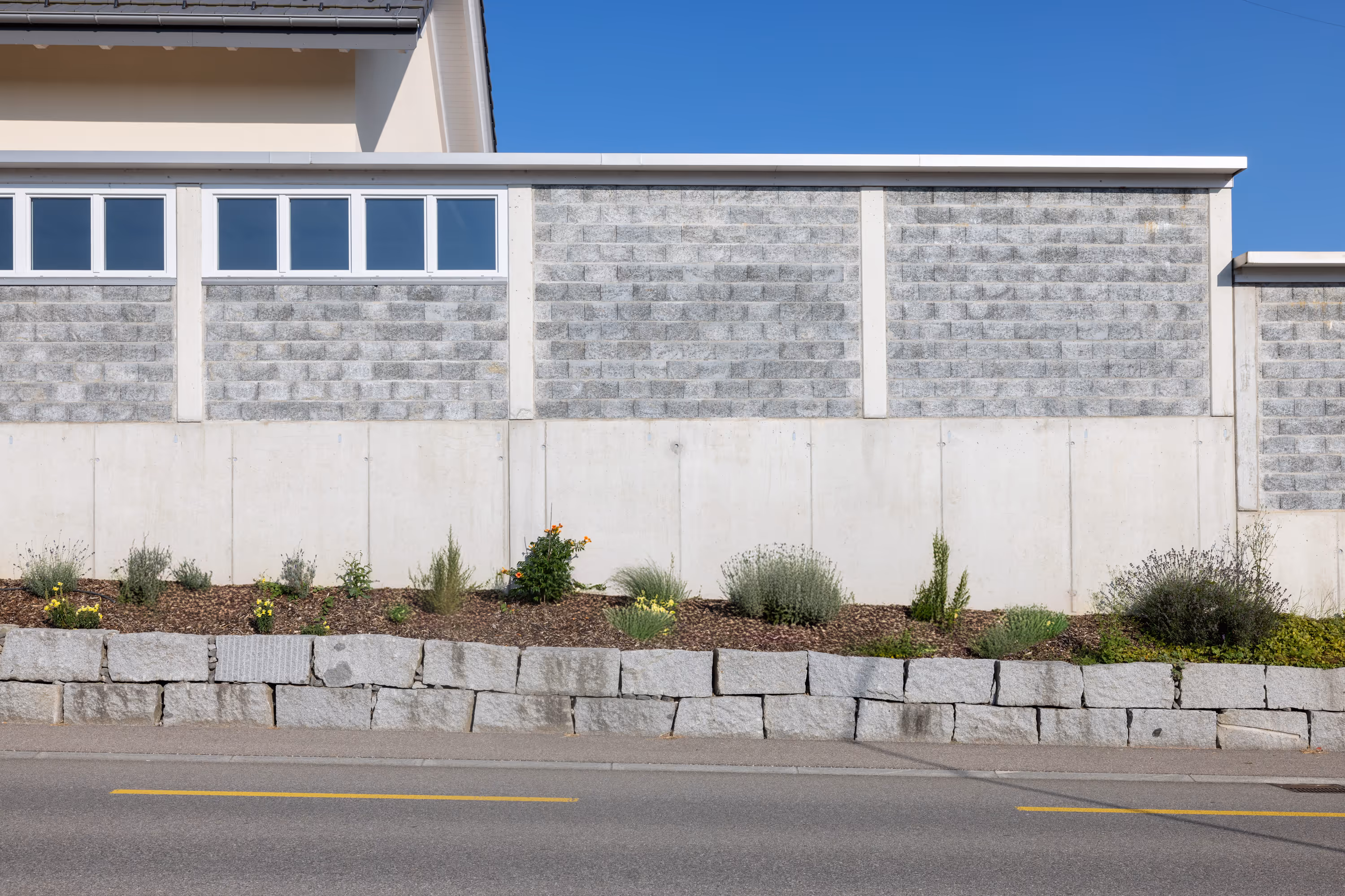 Schallschutzwand mit Fensterelementen, mit Integration von anschliessenden Gebäudeteilen, tiefe Beton-Fundation mit unterschiedlichen Sohlentiefen