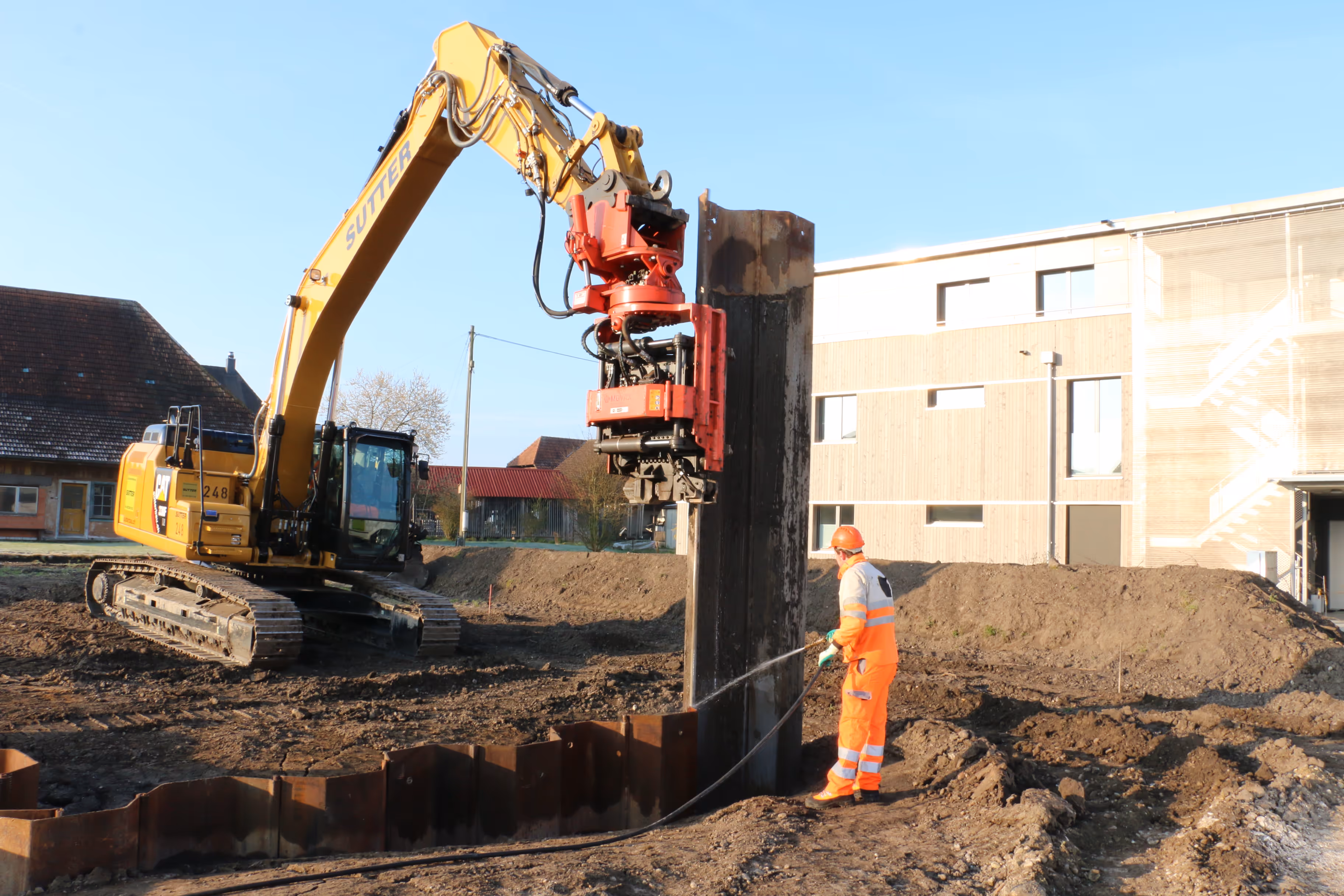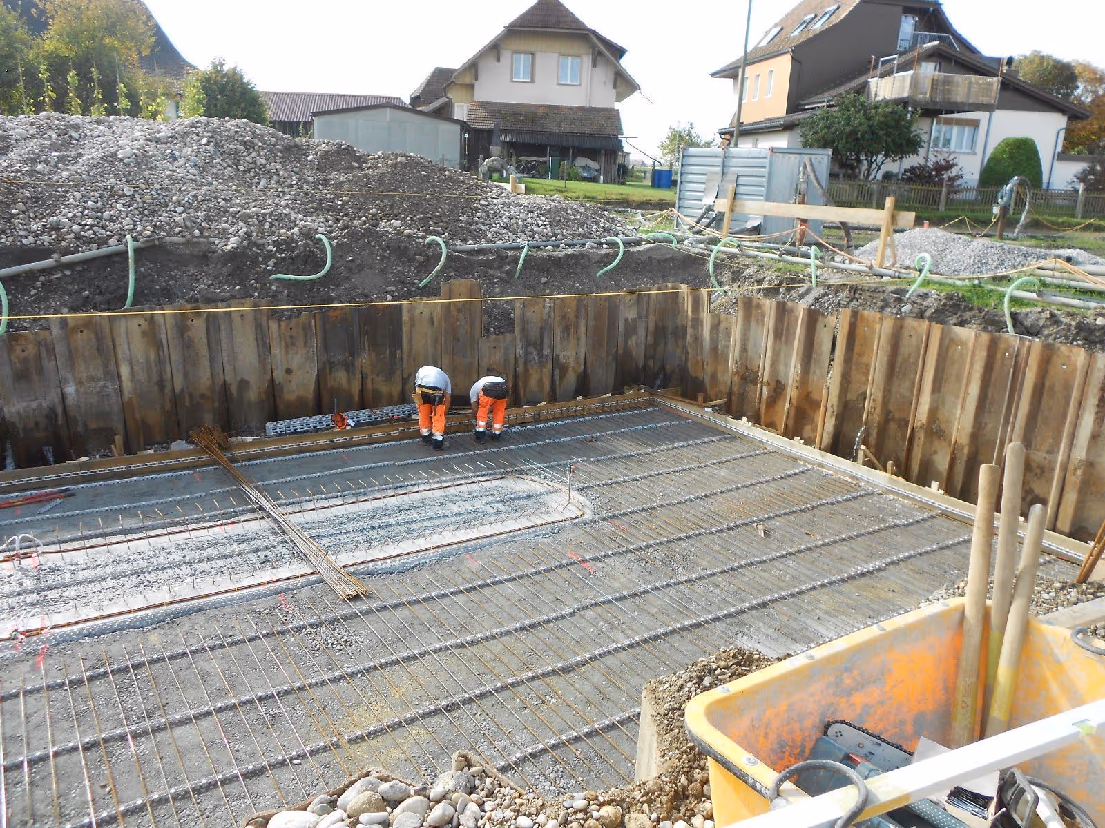 Bau von 6 unterkellerten MFH 3m im Grundwasser, Erstellen von 3300m2 Spundwand, Wasserhaltung bis 6000 Liter/Min mittels Baumeister-Filterbrunnen; Auftriebssicherung der Keller mittels Flutung; Abdichtung Weisse Wanne; Werkleitungen im Grundwasser; Sichtbetonarbeiten; Umgebungsgestaltung; Neubau Erschliessungsstrasse;